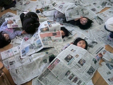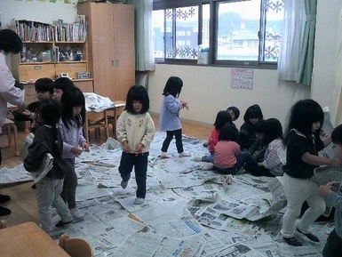 園庭遊びの予定でしたが、雨が降っていたため、お部屋で新聞紙遊びに変更しました。