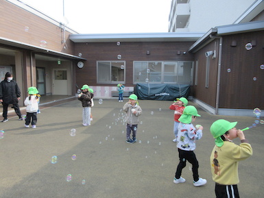 小さいシャボン玉を多く吹くことを楽しんだり、大きいシャボン玉を作ることに友だちと一緒に挑戦したりしながらシャボン玉遊びに取り組んでいました♪