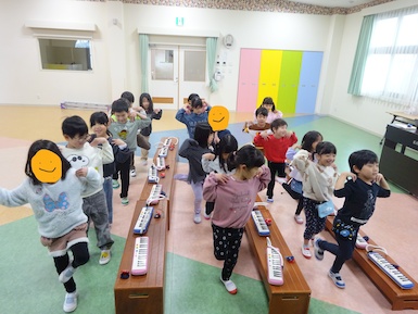 音楽教室では体を使ったリズム遊びをした後、『こぎつね』を鍵盤ハーモニカで演奏しました。