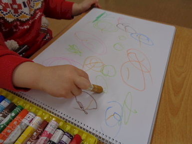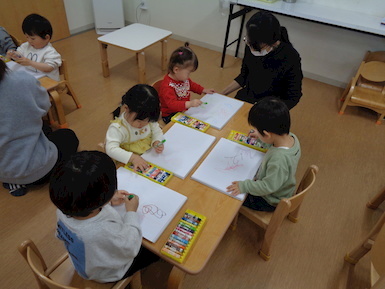 お絵描きでは、ぐるぐるまるまるを上手にたくさん描いたり、画用紙いっぱいに線を描いたりととても上手に取り組む子どもたちでした(*^-^*)
