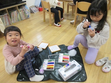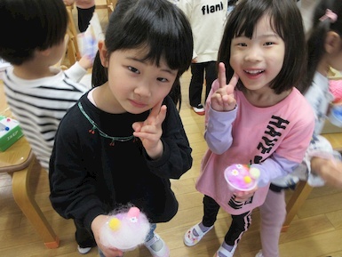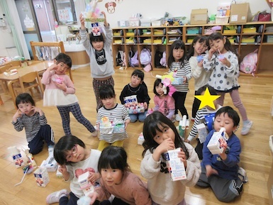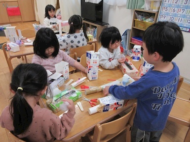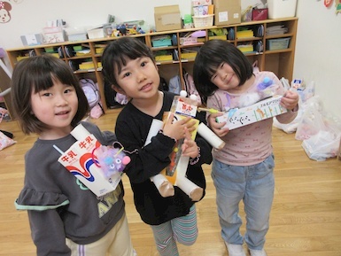 今日は廃材遊びでは、ティッシュの箱、トイレットペーパーの芯、牛乳パック等を使用しながら子どもたち一人一人が発想を膨らませながら時間いっぱい取り組みました(*'ω'*) ジュースやクマさん、鉄砲等オリジナル作品が出来上がるとお友だち同士で気になるところを質問したり、互いに褒め合ったりしながら廃材遊びを楽しんでいました♪ 本日子どもたちが作った作品はお持ち帰りにしておりますのでお家でまたお話してみてくださいね☆彡