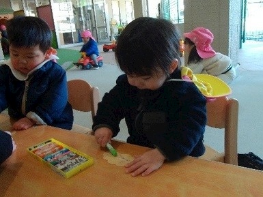 クレヨンを見ると、自分の好きな色を手に取って、鬼の髪の毛の台紙に色々な線や模様を描いて楽しんでいたりす組さん!