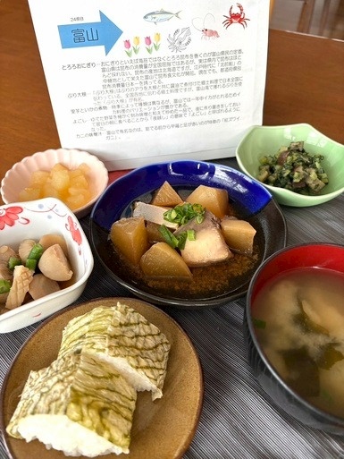 「第24回ご当地メニューの日」~全国おいしいの味、今月は富山県~ 2026年02月13日 ~お品書き~ ・とろろおにぎり ・ぶり大根 ・里芋といかの煮物 ・よごし ・カニの味噌汁 富山といえば、やはり海の幸と素朴な郷土料理。 メインは富山を代表する味覚「ぶり大根」。脂ののったぶりの旨味が大根にしっかりとしみ込んでいて、ご飯がすすむ一品です。 郷土料理といえば欠かせないのが「よごし」。野菜に味噌や胡麻を合わせた素朴なおかずで、食卓にあると一気に富山らしさ がでます。汁物には贅沢にカニを入れて、最後の一口まで満足感たっぷりでした。 次回は、岩手県です。お楽しみに☆彡 Tweet